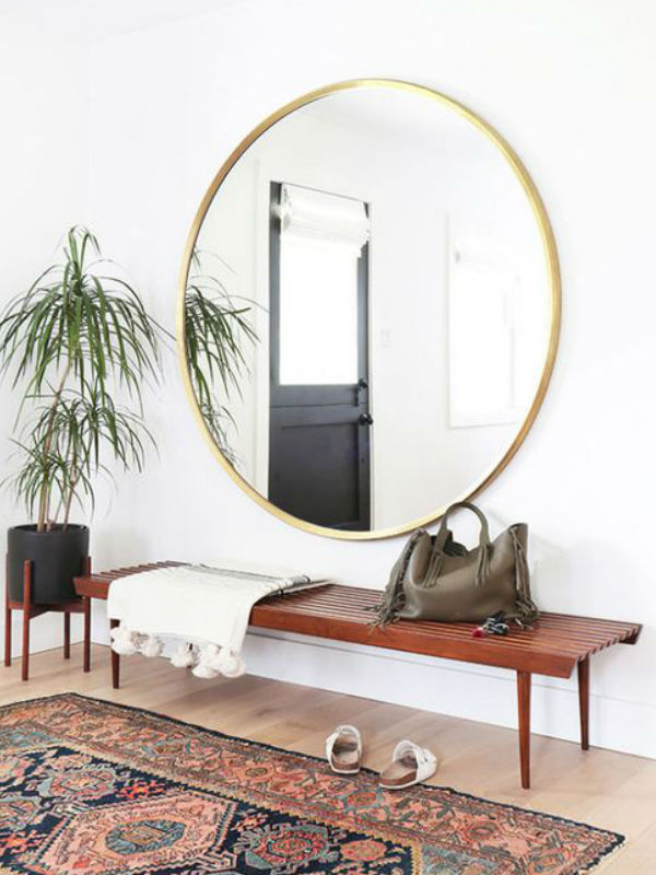Outro item que super ajuda na decoração é o espelho, por várias razões. Uma delas é dar a impressão de amplitude para o hall de entrada, que não costuma ser muito espaçoso. Outra é de poder dar aquela olhadinha no visual pra garantir que está tudo em ordem antes de sair de casa. E, por último, tem quem diga que ele pode afastar possíveis energias ruins vindas do universo externo… se é verdade ou não, a certeza que temos é que um espelho no hall de entrada fica lindo de qualquer maneira!